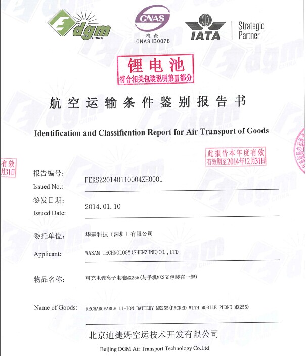 航空安全鑒定書是獲得鋰電池UN38.3檢測報告通過之后,向民航總局授權的機構申請之后,獲得的證書。北京迪捷姆DJM公司是深圳環測威檢測中心合作發證機構,可以快速為廣大客戶提供證書申請服務。