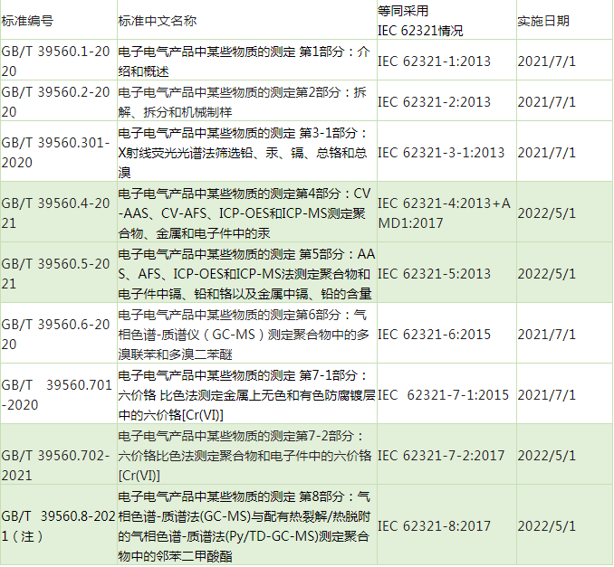 GB/T 39560系列標準是等同采用IEC 62321修訂發布的系列標準,標準的修訂是為了適應產業對新種類有害物質限制的要求和新型檢測技術發展,同時保持我國RoHS檢測技術及結果國際一致。GB/T 39560系列標準正式實施后會取代現行的中國RoHS配套的檢測標準(GB/T 26125-2011)。
