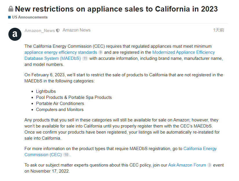 以上必須滿足CEC Title20電器能效標(biāo)準(zhǔn)要求,并在CEC能效數(shù)據(jù)庫(kù)系統(tǒng)(MAEDbS)中注冊(cè)列名,注冊(cè)信息包括品牌名稱、制造商名稱和型號(hào)等。也就是說以上品類必須滿足CEC Title 20 能效認(rèn)證,并在CEC 能效數(shù)據(jù)庫(kù)系統(tǒng)(MAEDbS)中注冊(cè)。如無CEC MAEDbS注冊(cè)的將無法在加州銷售,一旦賣家完成MAEDbS注冊(cè)將自動(dòng)恢復(fù)銷售。